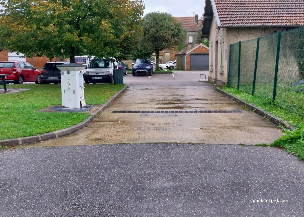 Deux emplacements devant l'entrée du camping fermé en fin de saison. Parfait pour une nuit et refaire les niveaux. Y avons passé une nuit pluvieuse au calme une fois partis les derniers visiteurs du stade. Lidl et commerces sont à 5 mn à pied, commode. Merci à la municipalité.