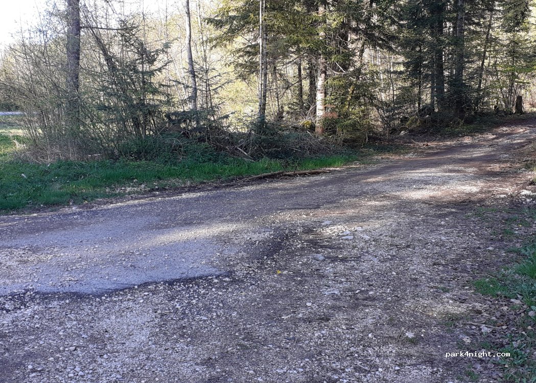 Petit recoin dans la forêt le long de chemin de rando qui mène au belvédère. A 10min à pied du lac et du départ de cascade du herisson. Route un peu passante la journée mais plus du tout la nuit. Plat. Place pour 2cc. Depanne bien dans ce coin très touristique.