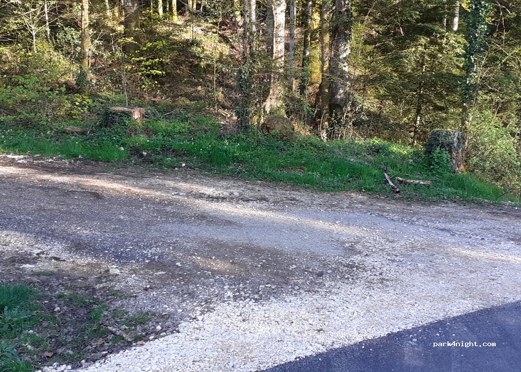 Small corner in the forest along the hiking trail that leads to the belvedere. 10 minutes walk from the lake and the start of the Herisson waterfall. Road a little busy during the day but not at all at night. Flat. Space for 2cc. Good help in this very touristy area.