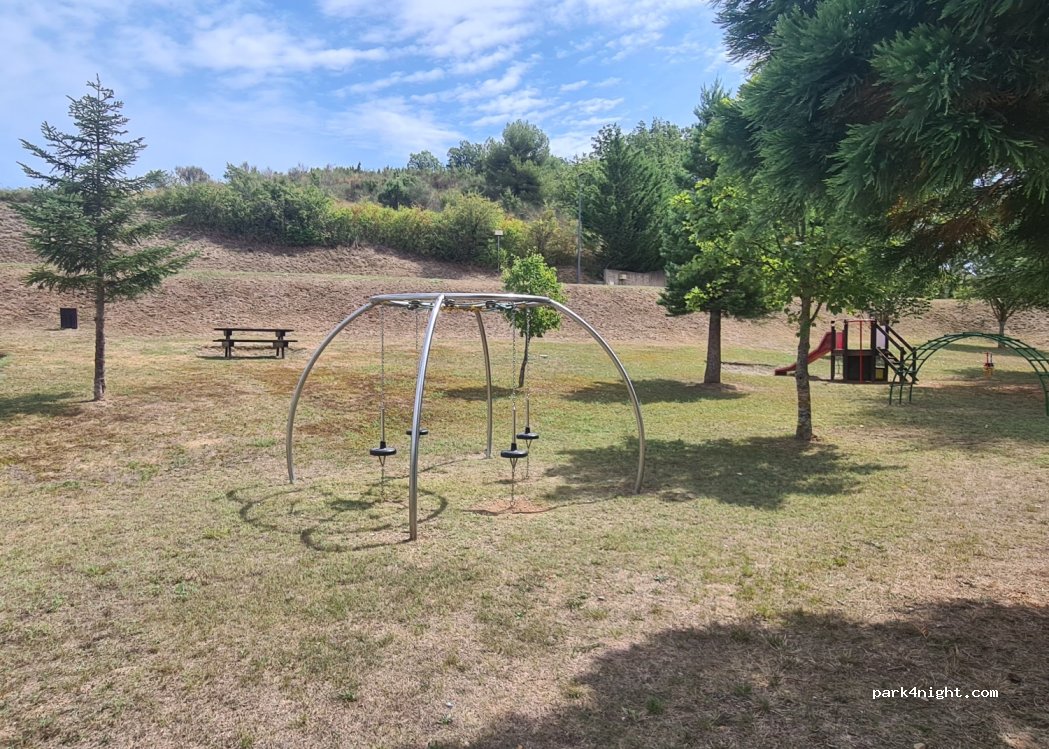 Parque infantil con un pequeño aparcamiento al lado con un estadio municipal y 2 mesas de picnic y árboles para dar sombra.