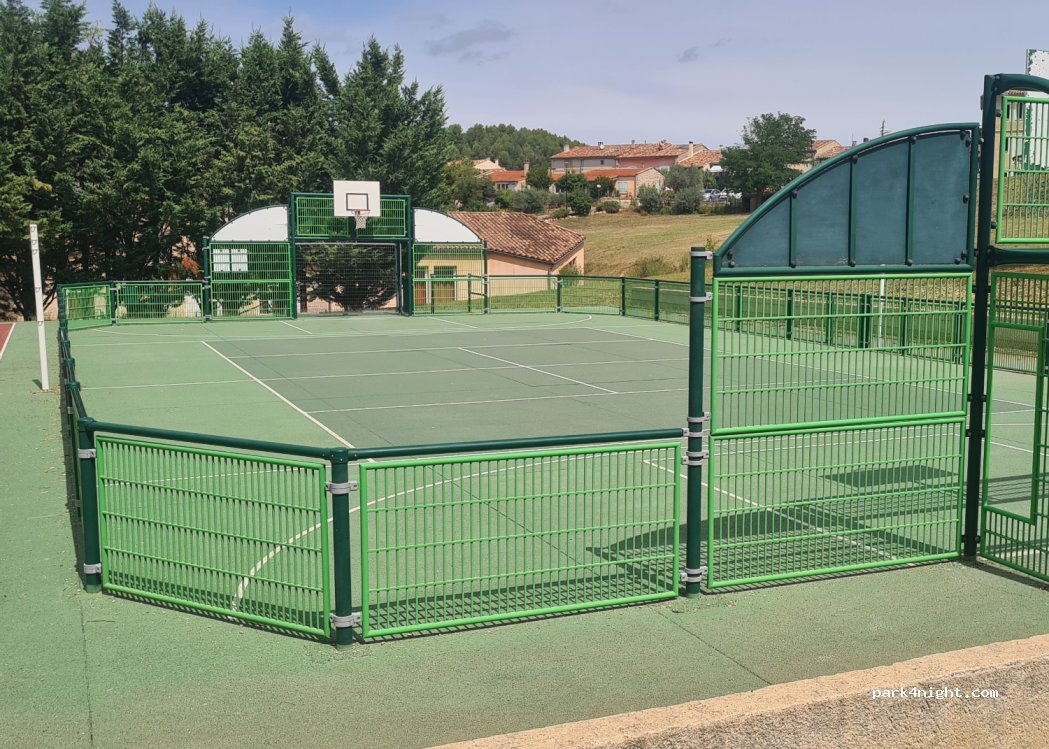 Parc de jeux pour enfants avec petit parking juste à côté avec city stade et 2 tables de pique-nique des arbres pour l'ombre.