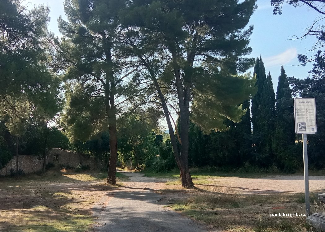 A 200 m. derrière le parking, aire gratuite sans service, calme et ombragée, proche commerce, prendre direction caserne des pompiers.