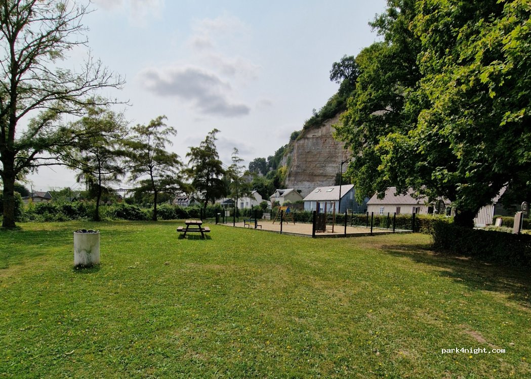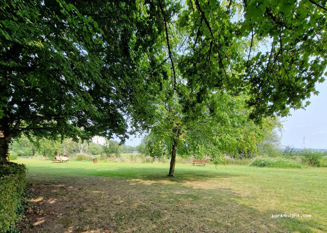 Aire de pique-nique avec 2 tables et aire de jeux.