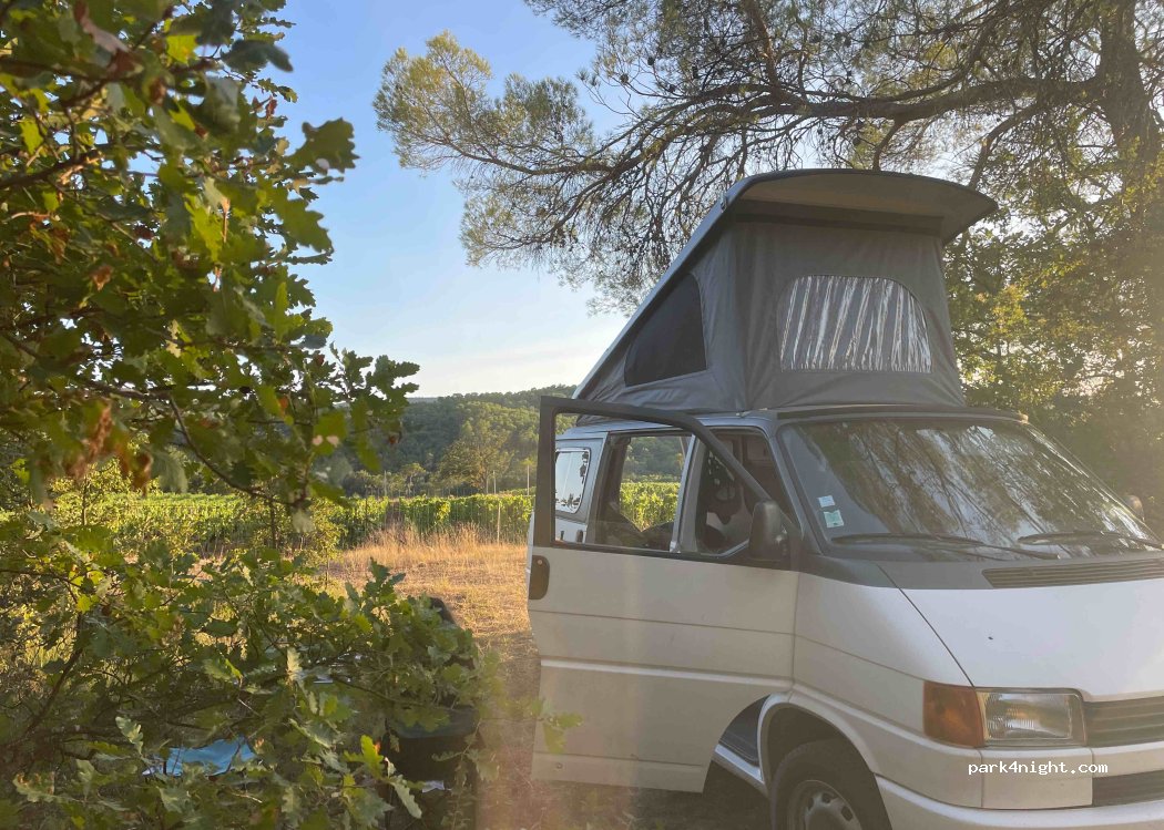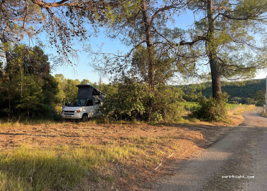 In the shade in the afternoon and evening on the edge of the vineyard with a view of the Var hills, small road, no traffic. Flat spot for 3-4 places. Very quiet for one night. The river is 1 km away.