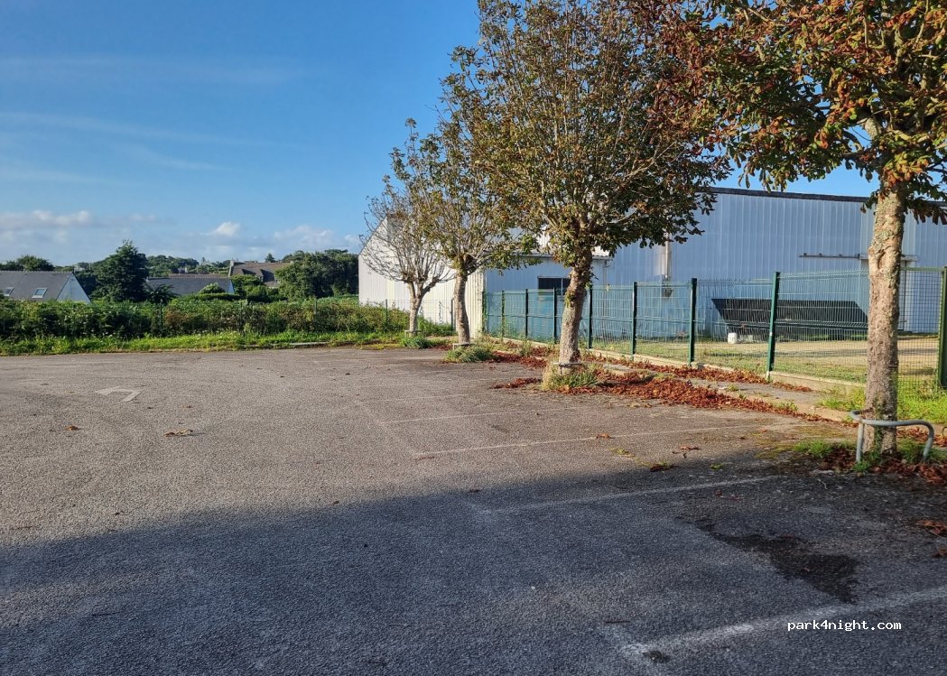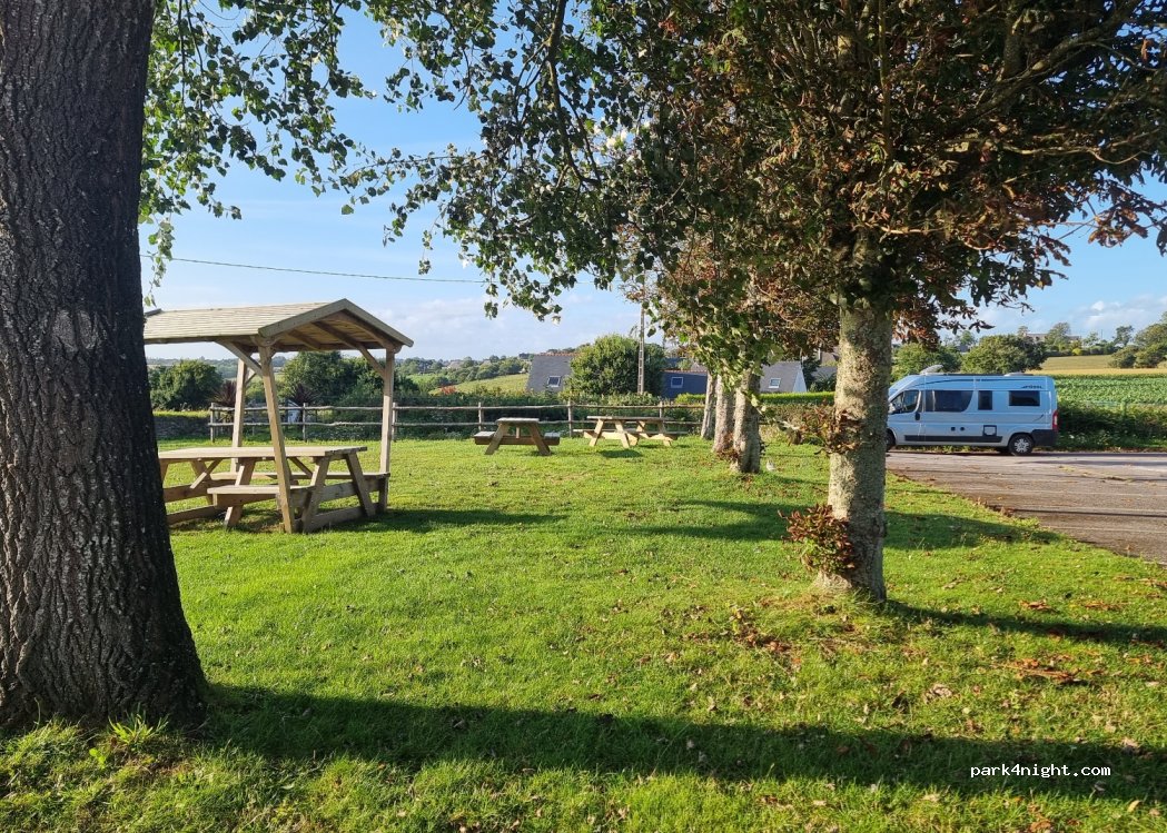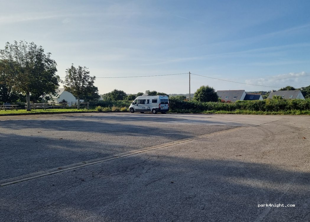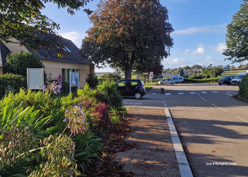 Grand parking derrière la Mairie. Tables de pique-nique à disposition. A côté d'une pelouse. Nous avons passé une nuit tranquille. Il y a des toilettes publiques de l'autre côté de la route principale, en face de la Mairie.