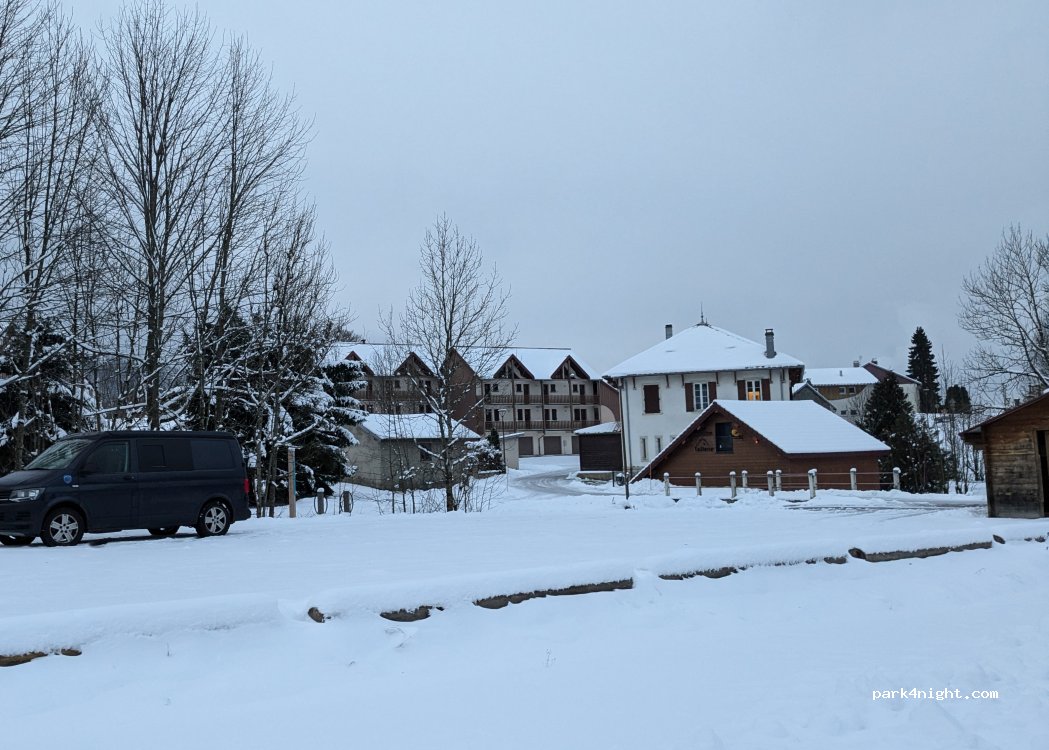 Belle découverte que cette petite station permettant ski alpin, nordique ou raquettes. Accès facile en hiver depuis Morbier, hormis le chemin, qq mètres avant l'aire, un peu verglacé mais praticable. Eau et électricité disponibles dans le petit chalet de l'aire. Location matériel et achat forfait sur place (250m). Piste raquette passe devant l'aire. Un resto dans le village, pas de boulangerie.