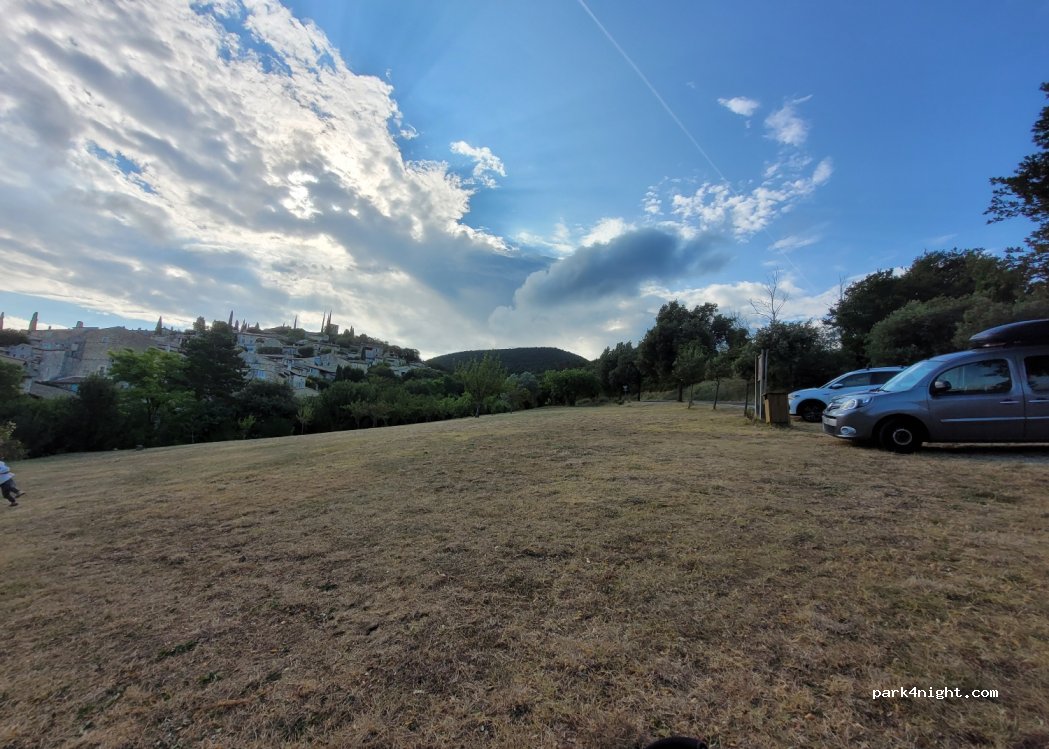 Grande zone enherbé avec table de pique nique parking à proximité et superbe vu sur le village de Mirmande (plus beau village de france), possibilité de se garer en camping-car au bord de la route entre les oliviers
