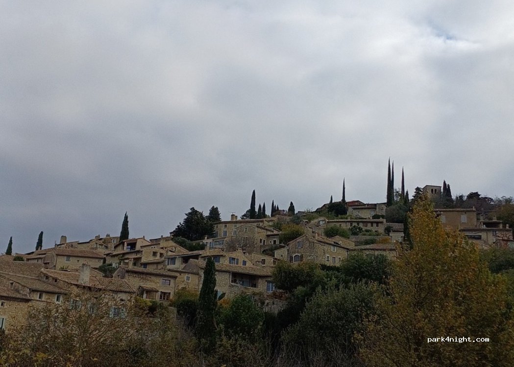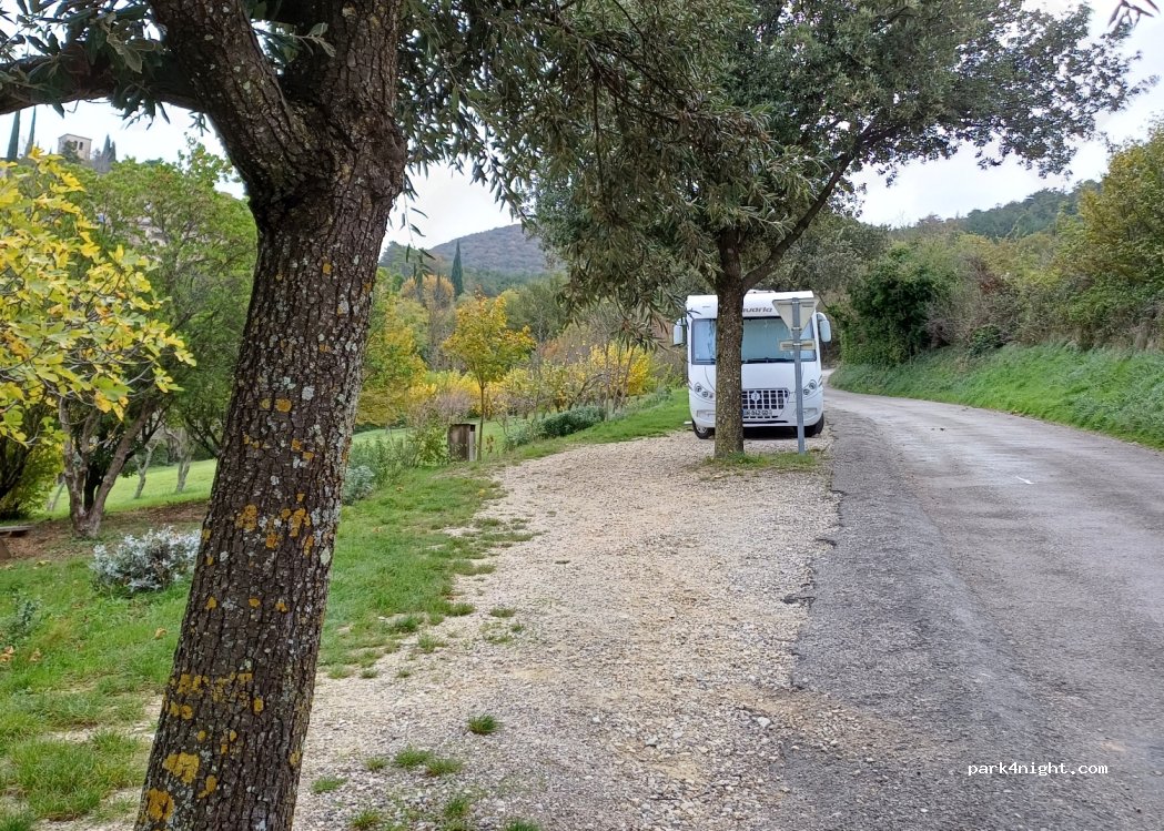 Large grassy area with picnic table, parking nearby and superb view of the village of Mirmande (most beautiful village in France), possibility of parking a camper van at the side of the road between the olive trees
