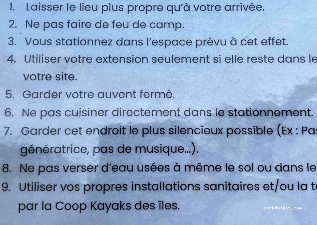 Bel endroit simple à proximité du traversier de Trois-Pistoles à Escourmin avec vue sur l'eau/rivière. Possibilité de séjour d'une nuit seulement, 25 $/p. nuit en août 2024 (auto-inscription). Les toilettes sont des toilettes chimiques. Nous nous sommes bien reposés en venant d'Escourmin, nous aurions aimé connaître l'endroit plus tôt, bonne alternative au camping de l'autre côté de la rivière.