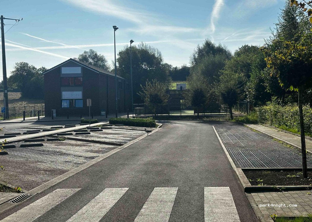 Parking du centre sportif. Aucune restriction, parking en gravier, plat. Obliques courtes vers 5h40 mais possibilité de 4-5 places en ligne sans limite de longueur.