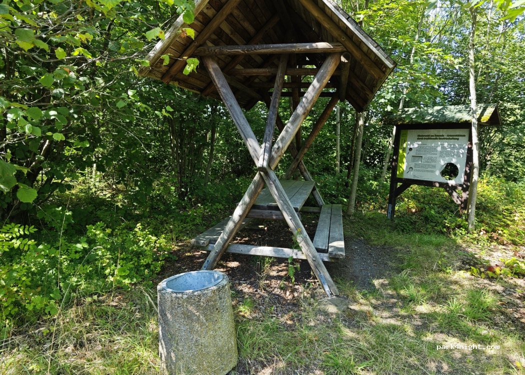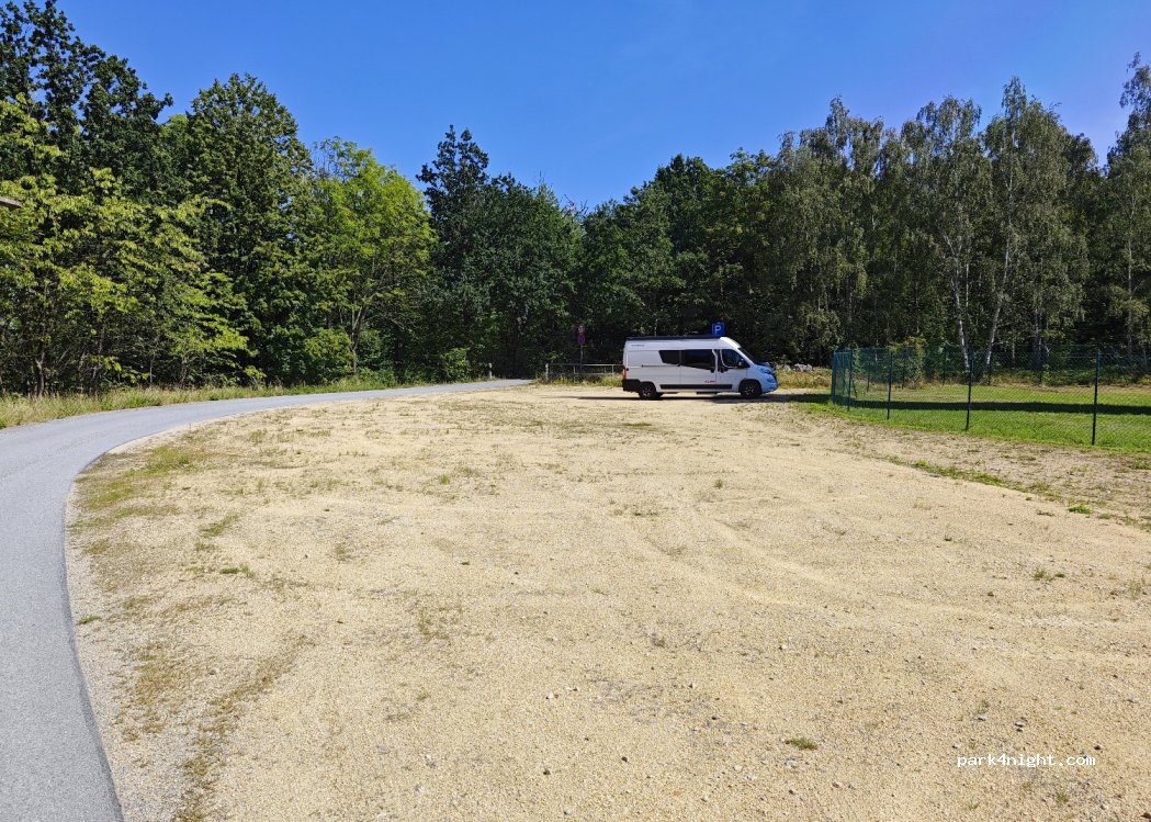 Riesiger Parkplatz auf dem Berg (Sackgasse) gelegen. Sehr eben und nachts sehr ruhig, im Wald. Restaurant 800m weiter. Mit kleinem Mülleimer und Picknicktisch. Zufahrt recht schmal aber auch für große Camper machbar. Unten im Ort gibt es einen weiteren Parkplatz.