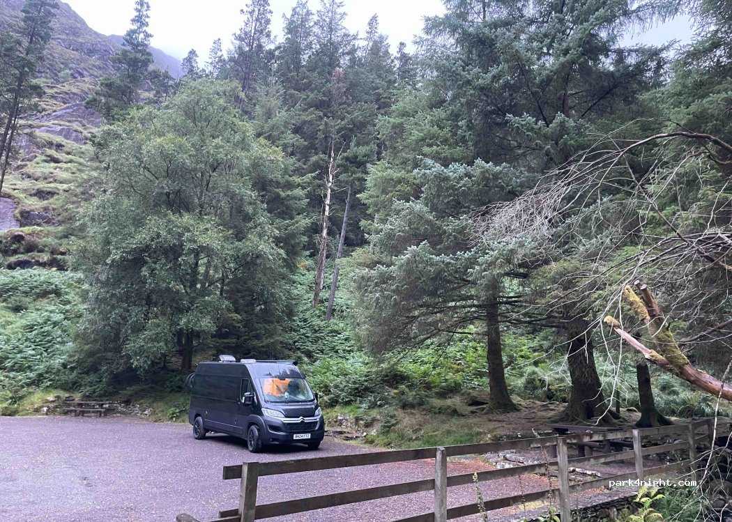 Parking at far end of the loop so after the Forest Park entry barrier. Room for 4+ campervans. Very very quiet and great spot for hikes around Gougane Barra Forest Park