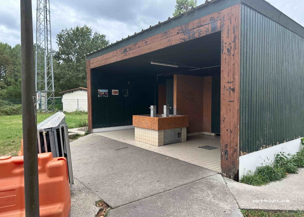 Aire de picnic avec toilettes, robinets, tables et poubelles.