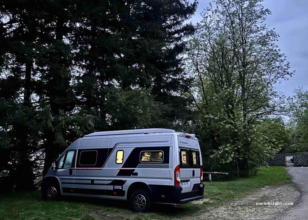 Attention routes étroites pour traverser le village. Ne pas rester sur le parking en pente du vieux cimetière, monter encore un peu jusqu’au départ de la voie verte. Calme ombragé, pas de service mais très agréable. Attention en sortant bien redescendre vers le village, la rue qui monte est une impasse.