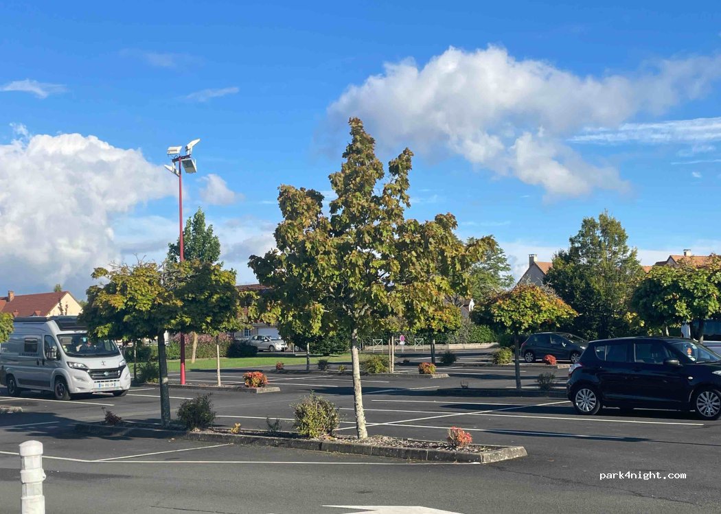 Parking au calme à proximité immédiate de la ville. Grand parking et petit parking 20m plus loin à côté du stade (tennis, boulodrome, foot). Attention ne pas se garer au delà sur le parking du tennis en gravier/herbe car fermé la nuit.