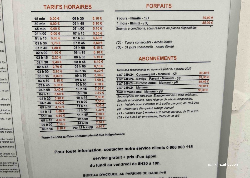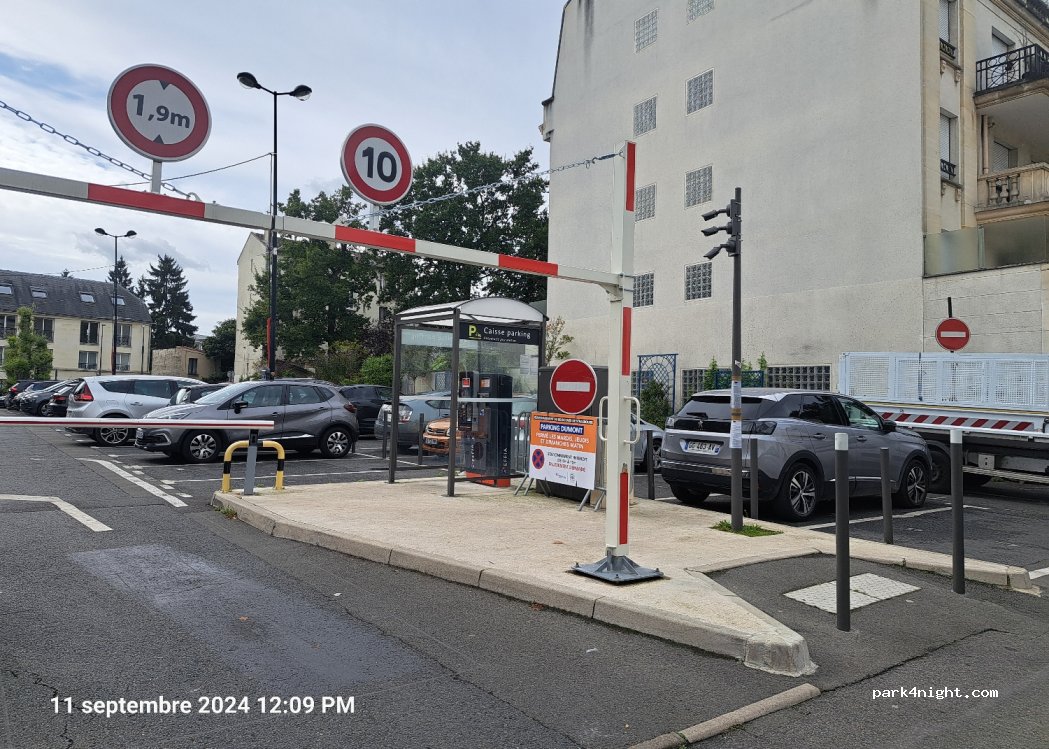 Dumont car park. paid parking. part with 1.90 bar with no time limit, free at night and part with no height limit but limited time, free after 7 p.m. No ban at night or for camper vans. next to the Rer B Aulnay-sous-Bois station. due to works currently closed in the morning until 3 p.m. on market days Tuesday, Thursday, Sunday. not suitable for large vehicles.
