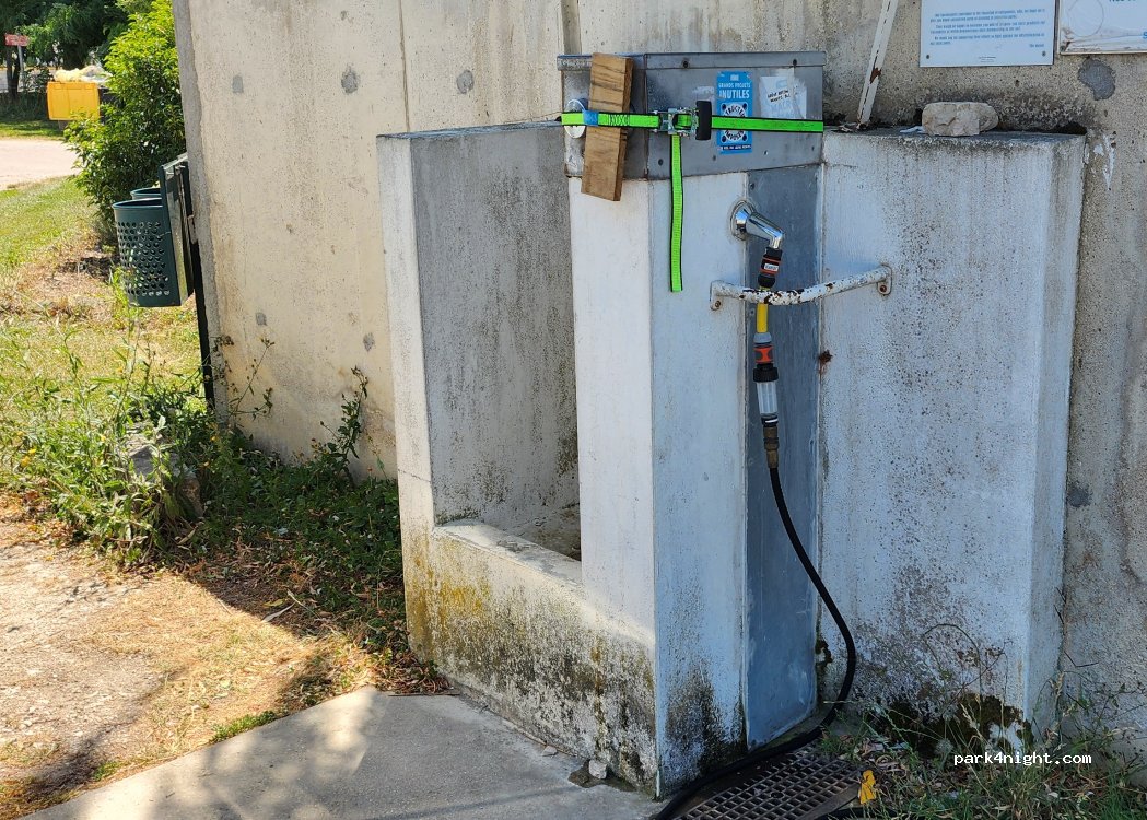 Aire de services eaux grises + noires + eau potable gratuite ce qui est hyper appréciable ! En revanche ce n’est pas pratique de rester appuyé sur le bouton poussoir pour le remplissage d’eau (surtout sous une pluie battante pour notre part !!!) Merci quand même !