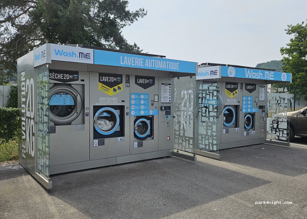 Laverie extérieure en libre-service, à côté de l'entrée du supermarché U-tile. Il y a 2 machines à laver et un sèche-linge.