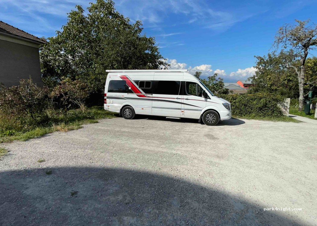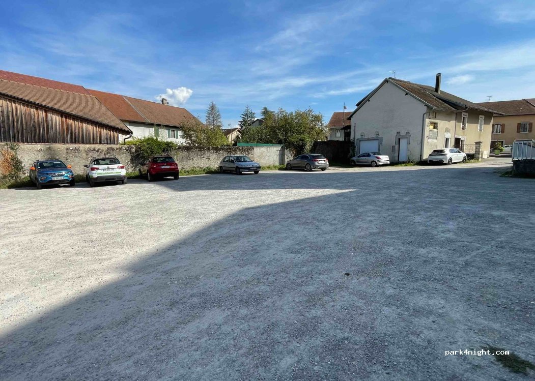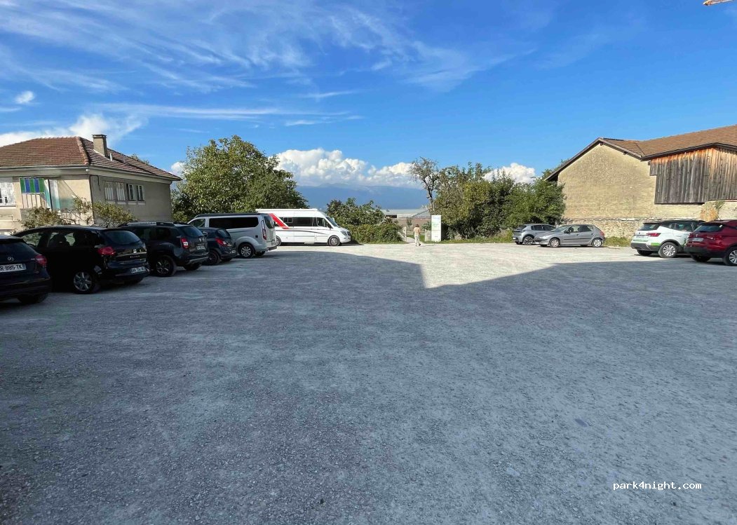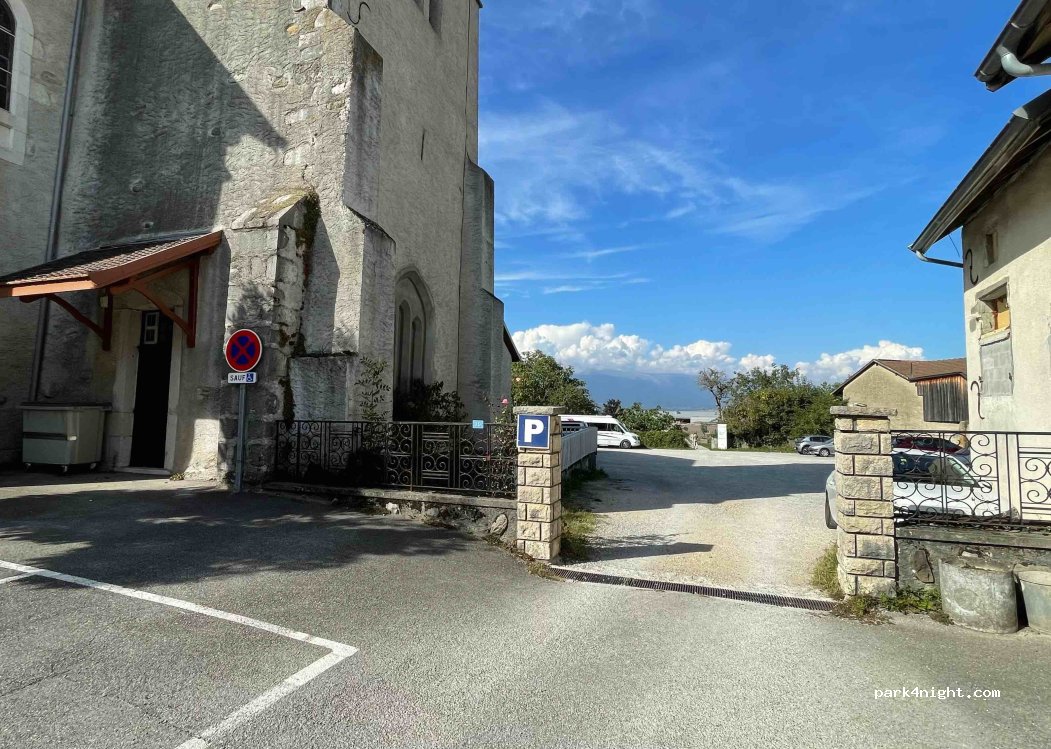 Parking municipal gratuit sur gravier dans le village de Valleiry ouvert 24/24, aire de pic-nic à côté avec table et banc, toilette municipal tout proche si besoin. Juste derrière l’église les cloches sonnent régulièrement. Sans service