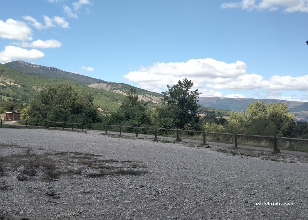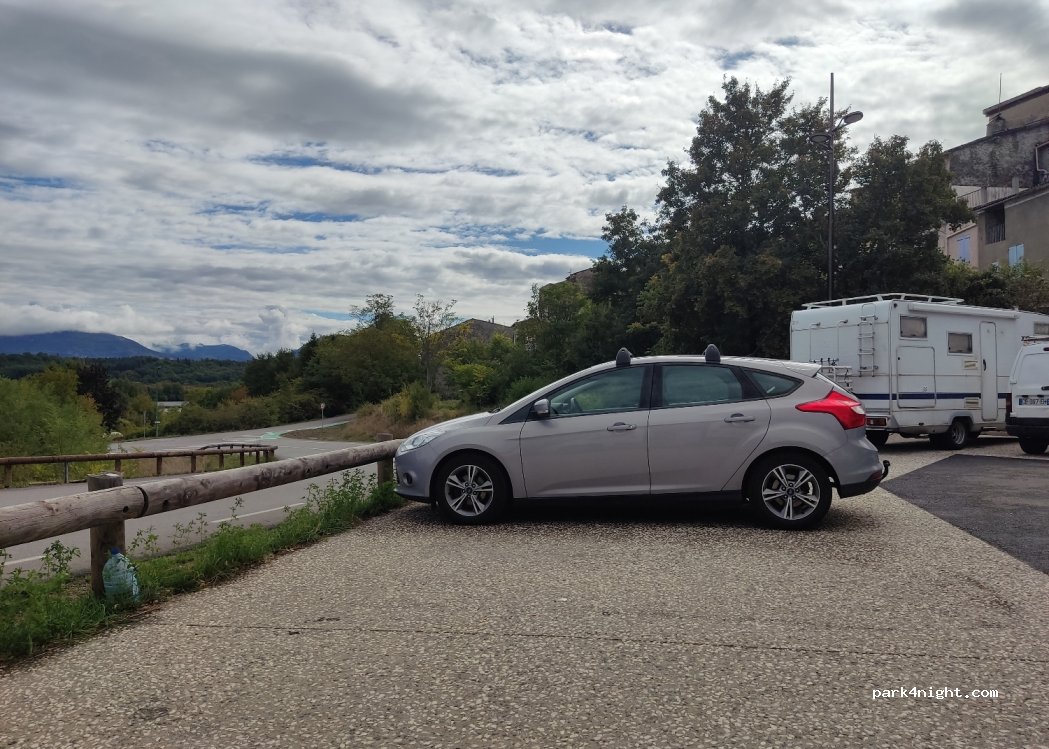 Small parking lot at the entrance to the town. There are restaurants and an excellent boulangerie in the town. The view over the countryside is very beautiful, there is through traffic on the adjacent road.