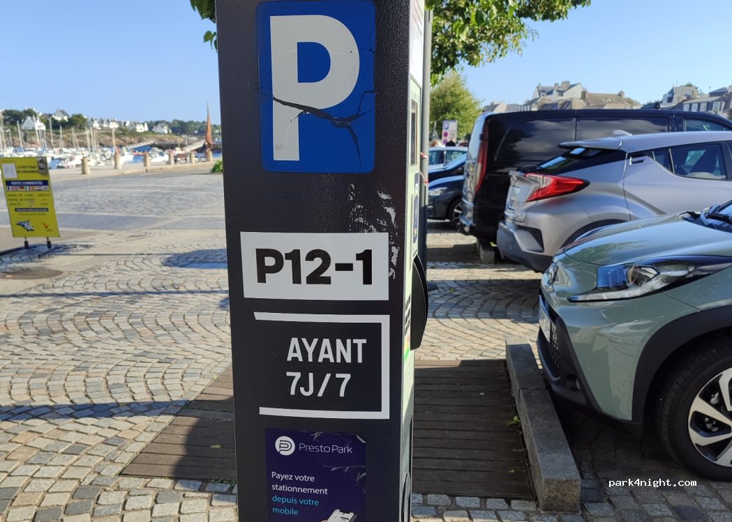 Parking de pago, prohibido aparcar los lunes y viernes. Justo en frente de la entrada de Ville Close de Concarneau.