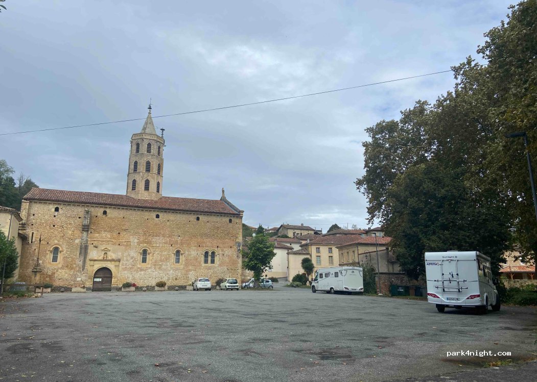 Aire de stationnement ouverte 24h/24 devant l'église de la petite ville d'Aulon. Il y a une aire de pique-nique juste de l'autre côté du pont appelée Aire la Bouzigue. L'endroit est très calme et l'église sonne toutes les heures.