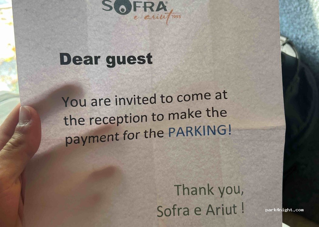 The restaurant parking lot is fenced. Google Maps will lead you to a closed gate, so it's best to enter through the Bear's Table restaurant parking lot. 1,000 leks per night, less than a 30-minute walk from the city center, and very safe.
