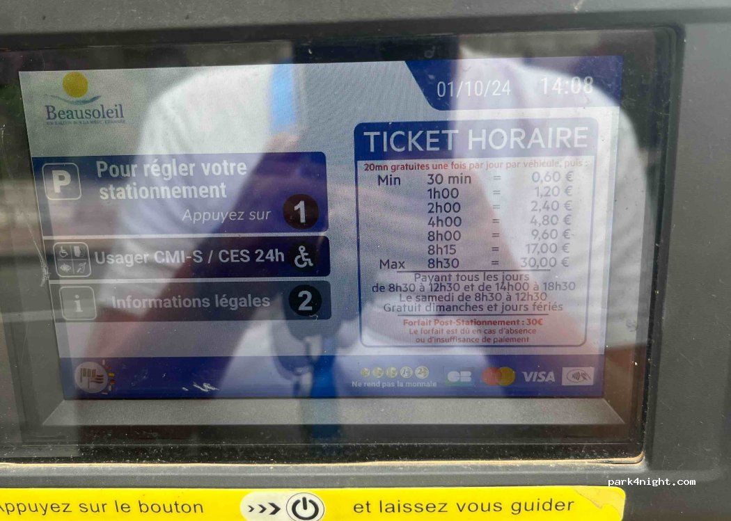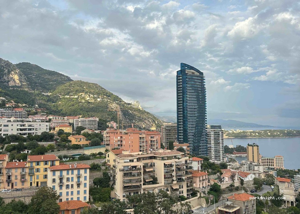Parking along the street in the Beausoleil area. You only pay between 8:30am and 12:30pm and again between 2pm and 6:30pm. You can get to the center in about 15 minutes using Monaco's staircase and elevator system. From the parking lot you have a great view of the sea and Monaco. OK for a night or a day trip. It's loud and steep, but that's the case everywhere here.