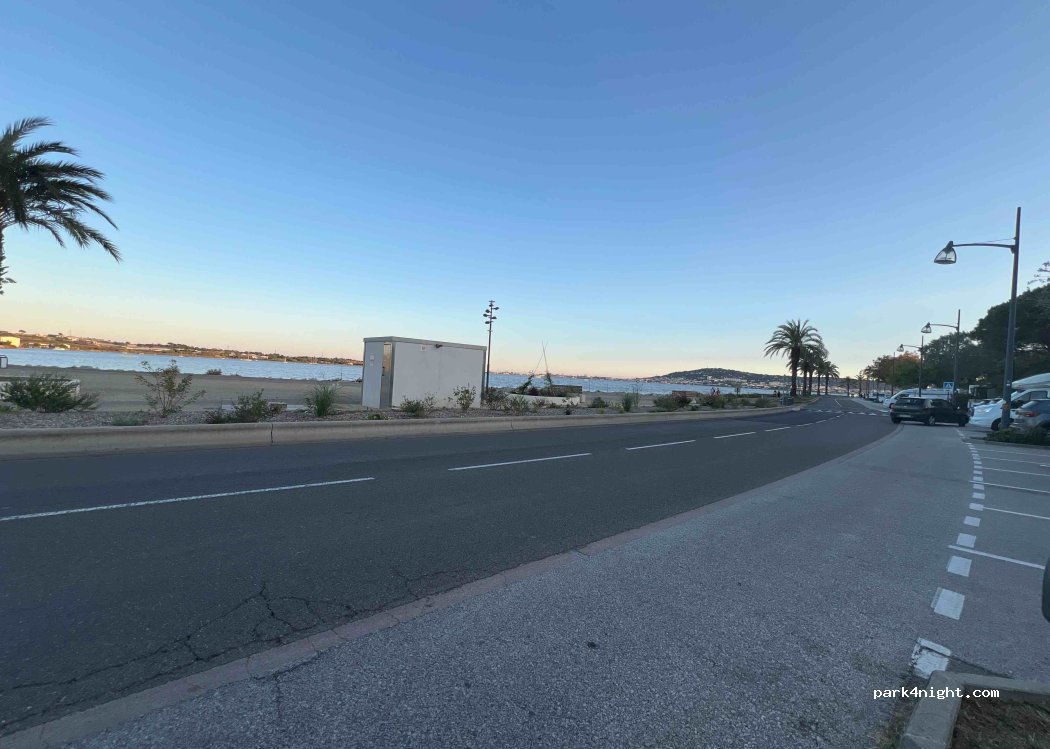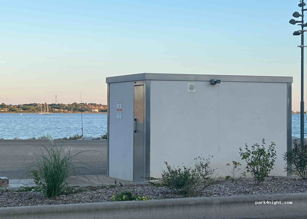Aseos públicos de autoservicio, mucho espacio de aparcamiento frente al estanque a lo largo del paseo marítimo.