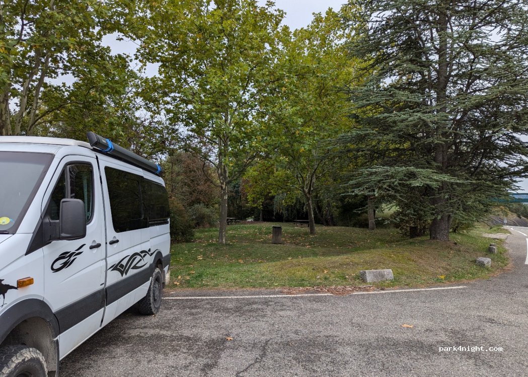 Place de parking juste à côté de la route à double sens avec des arbres et une table de pique-nique. Trop bruyant pour y passer la nuit, mais idéal pour déjeuner et promener son chien