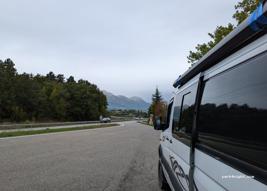 Parking spot just off the dual carriageway with trees and picnic table. Too noisy for staying over night but great for lunch and a dog walk.