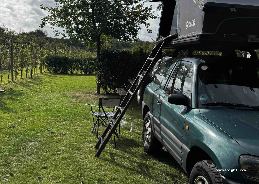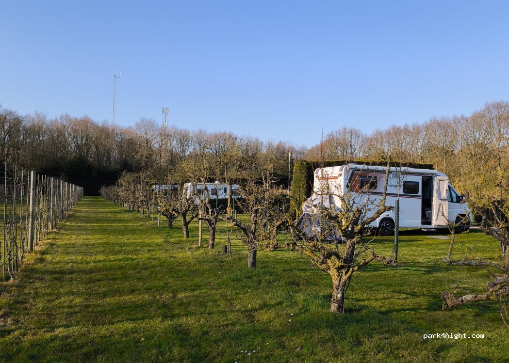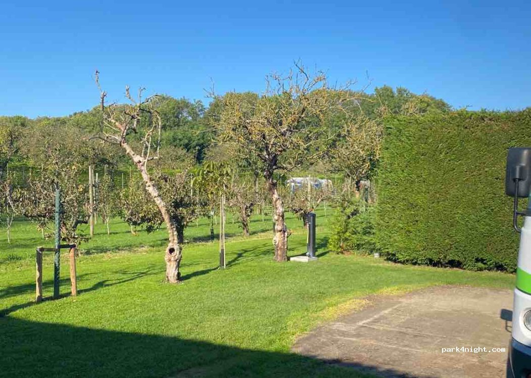 DuinRand Boomgaard-Camping campsite. This campsite has spacious pitches. The plots are partly separated by hedges. There are fruit trees in the middle. Everything is very well maintained. We received a very friendly welcome. The pitches are only to be used on the day of arrival and departure. So we leave our camper van here and ride our bikes. For caravan owners there is a small car park next door where the cars can be parked and picked up at any time for tours. It is very quiet and idyllic here. The beach is about 15 minutes away on foot.