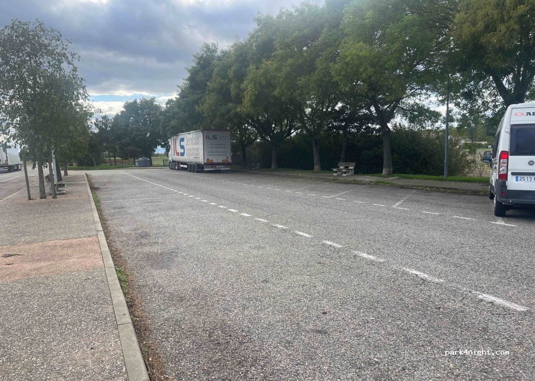 Àrea de descanso de Bellevue en la autopista. Espacio para camiones i otros vehiculos. Bancos, mesa picnic, reciclage.