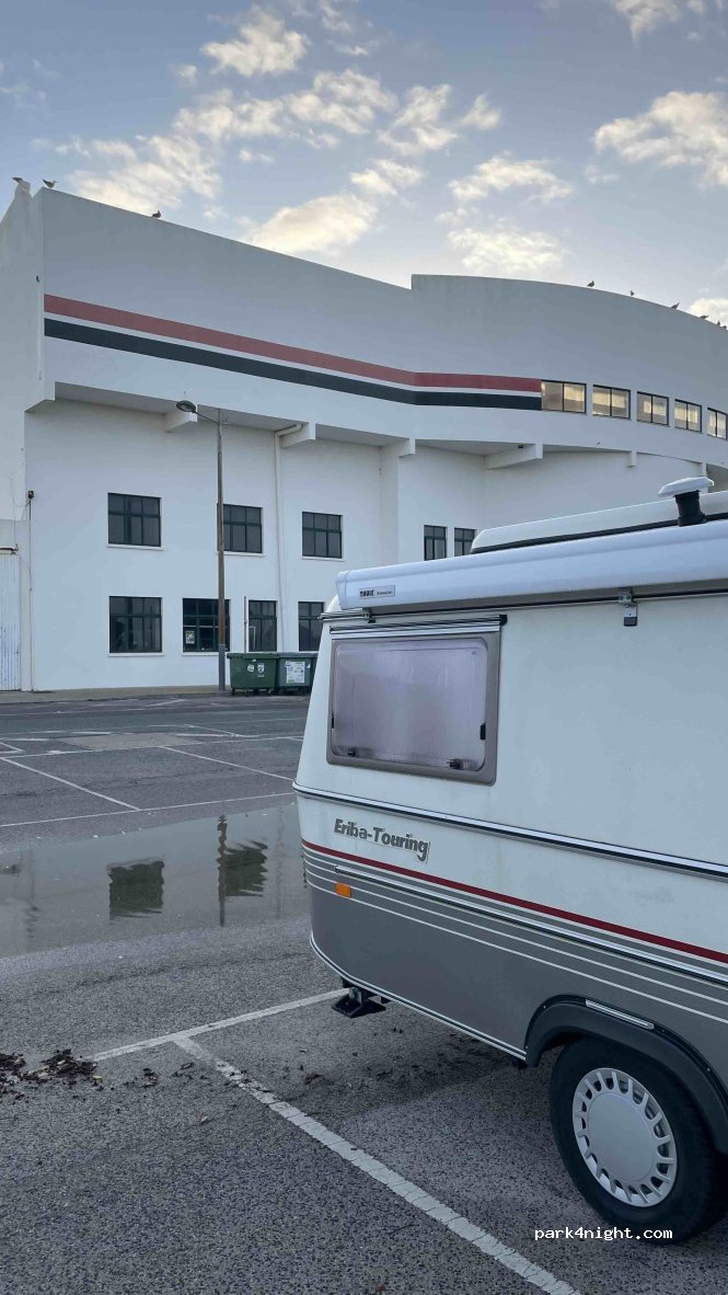 Football stadium parking lot. Good for an overnight stay (when there is no match). Beach and surfing 200m walk Excellent restaurant 200m walk opposite the beach. Public WC next to BP station. Quiet night sleep.