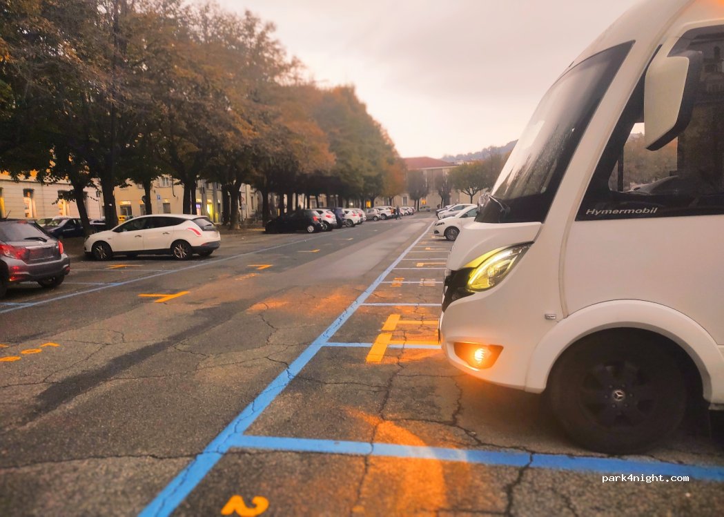 Ample paid parking in Pinerolo city center. Access is possible also for big vehicles but there aren't any services. There aren't any prohibition signs about overnight stays.