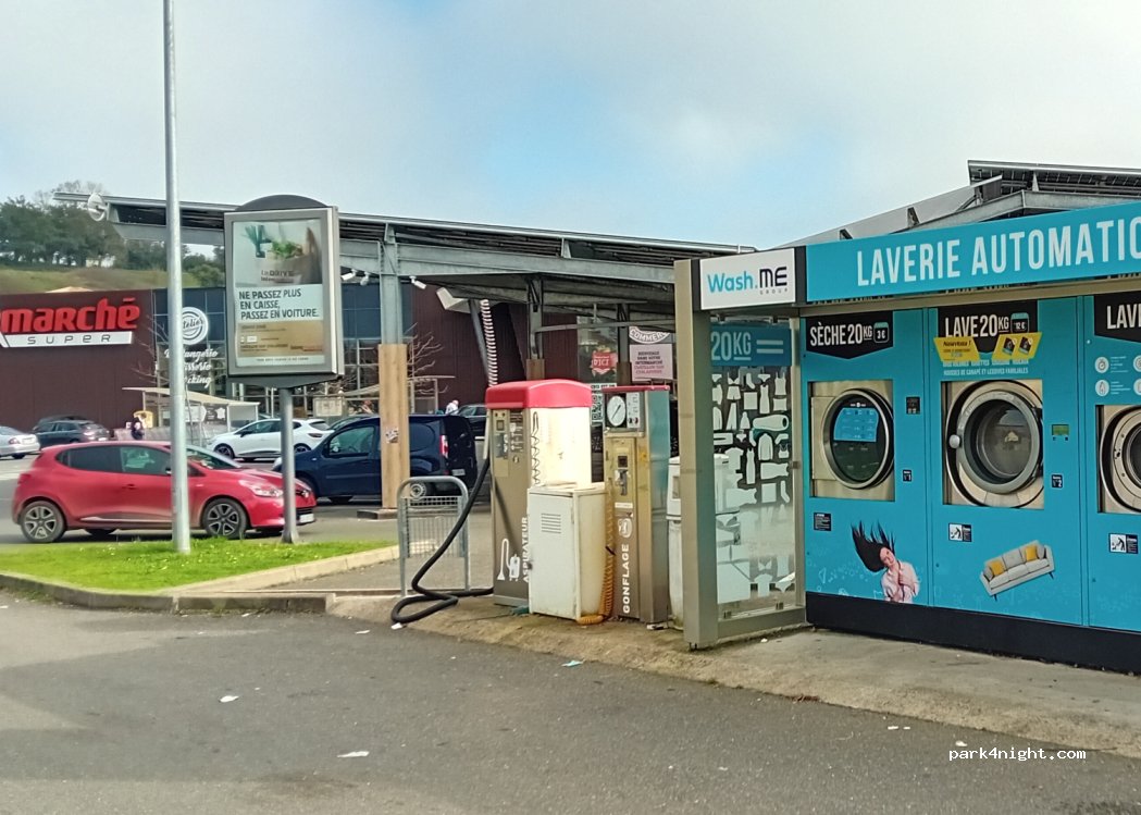 Wash.Me laundromat (clean machines) in the Intermarché Super parking lot. Also a pizza machine.