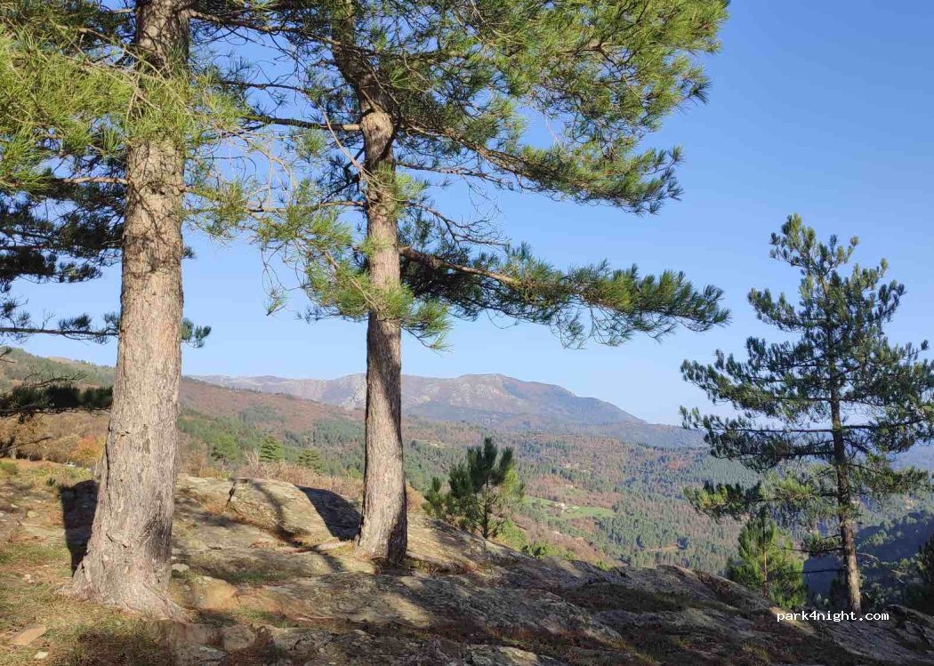 Bonito lugar, al borde de una carretera muy tranquila con hermosas rocas y pinos, y una vista al valle. Orientado al sol de la mañana. Posibilidad de colocar en plano. Sólo para furgoneta pequeña.