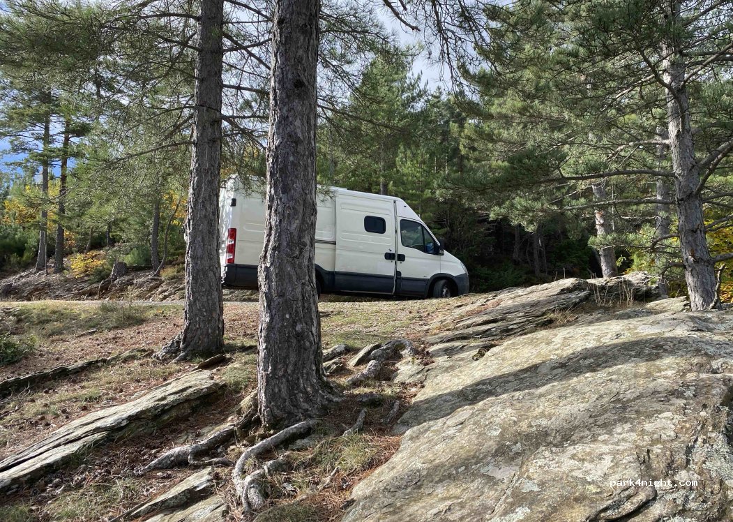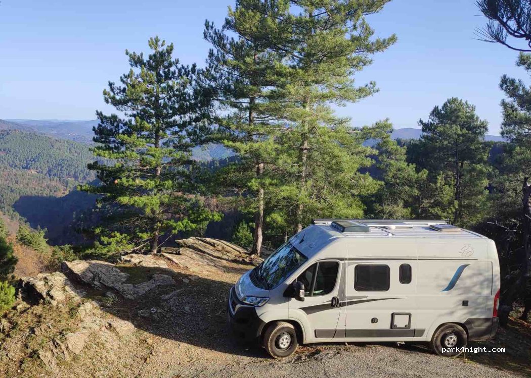 Nice spot, on the edge of a very quiet road with beautiful rocks and pines, and a plunging view of the valley. Facing the morning sun. Possibility of laying flat. Only for a small van.