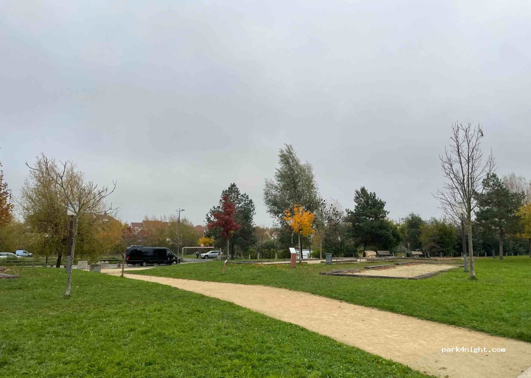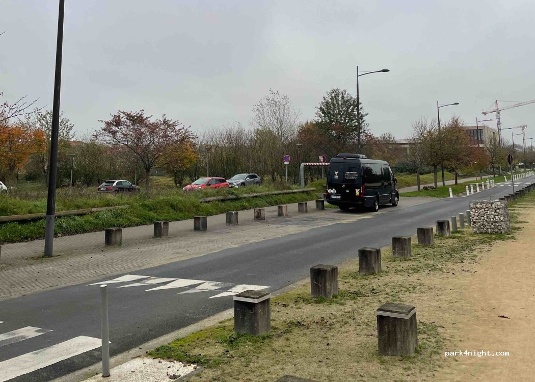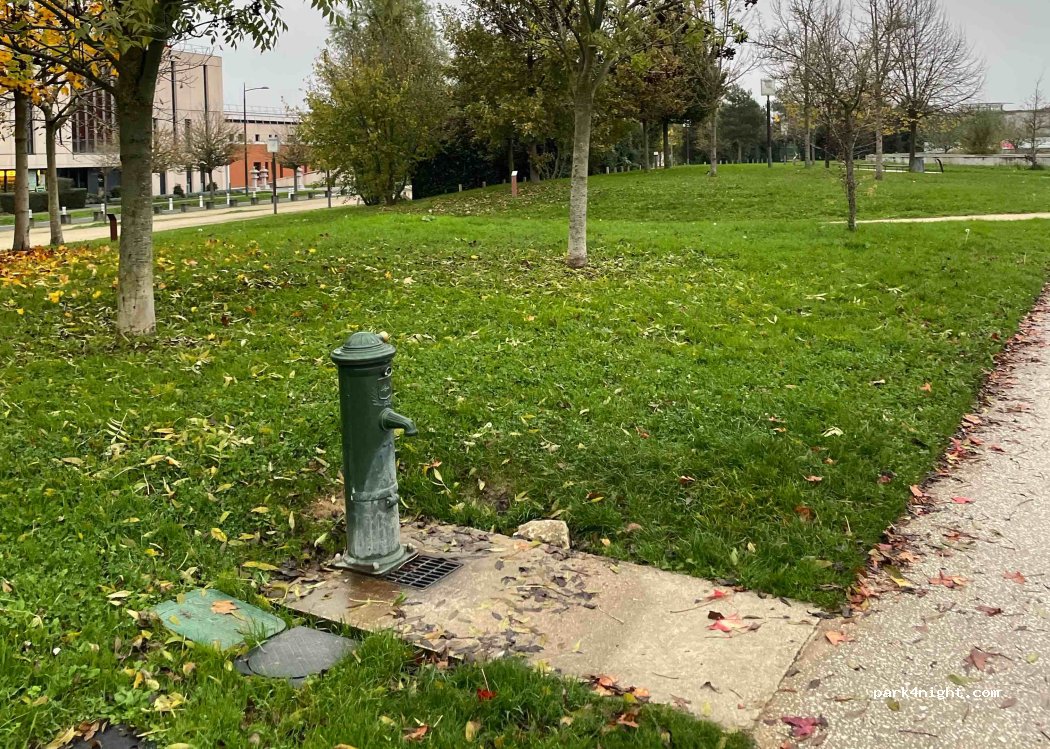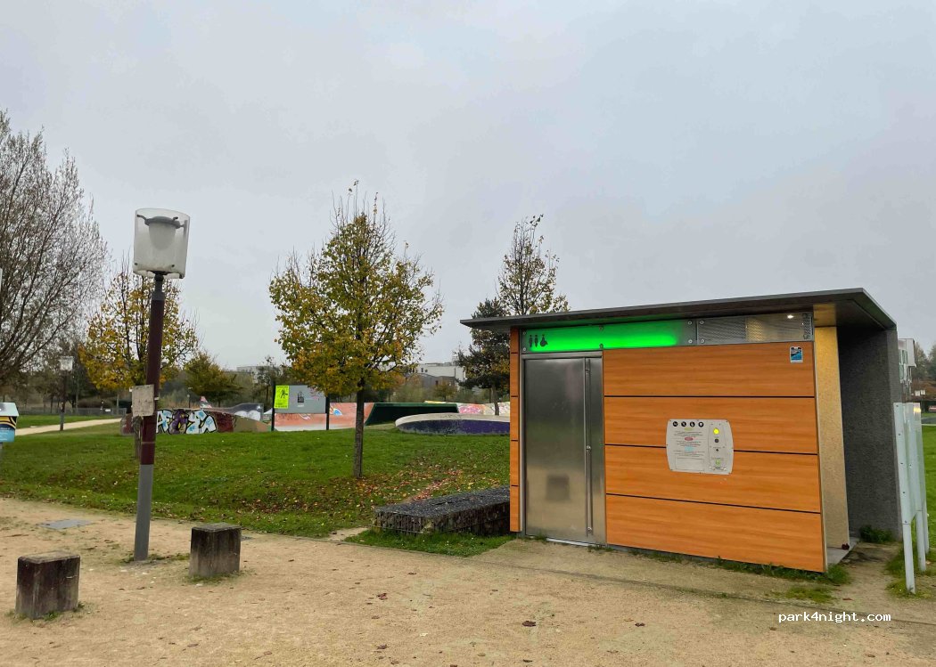 Place de parking pour passer une nuit avec parc à proximité, aire de jeux pour enfant, toilette publique et point d’eau robinet du parc.