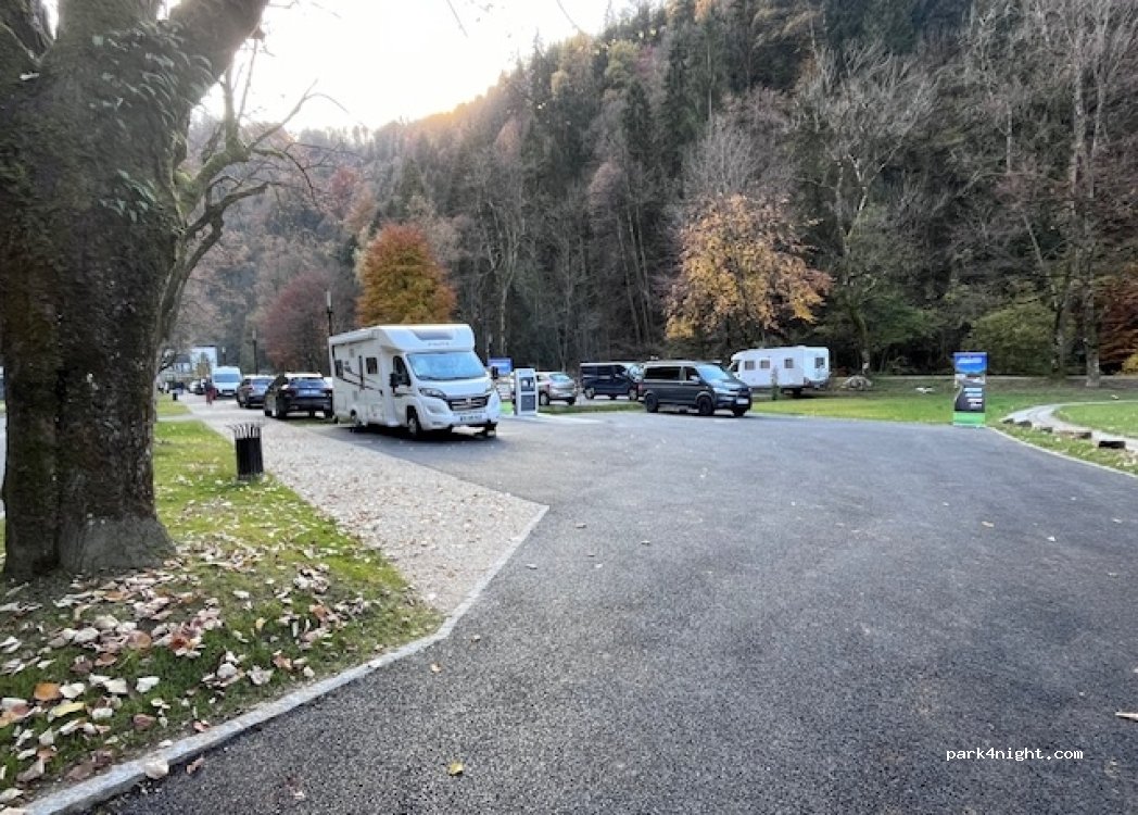 Endroit dans la nature, avec l'ascenseur pour aller au centre ville. Stationnement gratuit. Cependant, seulement 2 places utilisables alors qu'il est mentionné 8 places sur l'application Qipeo. Il y a 2 autres places marquées au sol pour l'aire de vidange mais si quelqu'un stationne là, plus d'accès à la vidange.