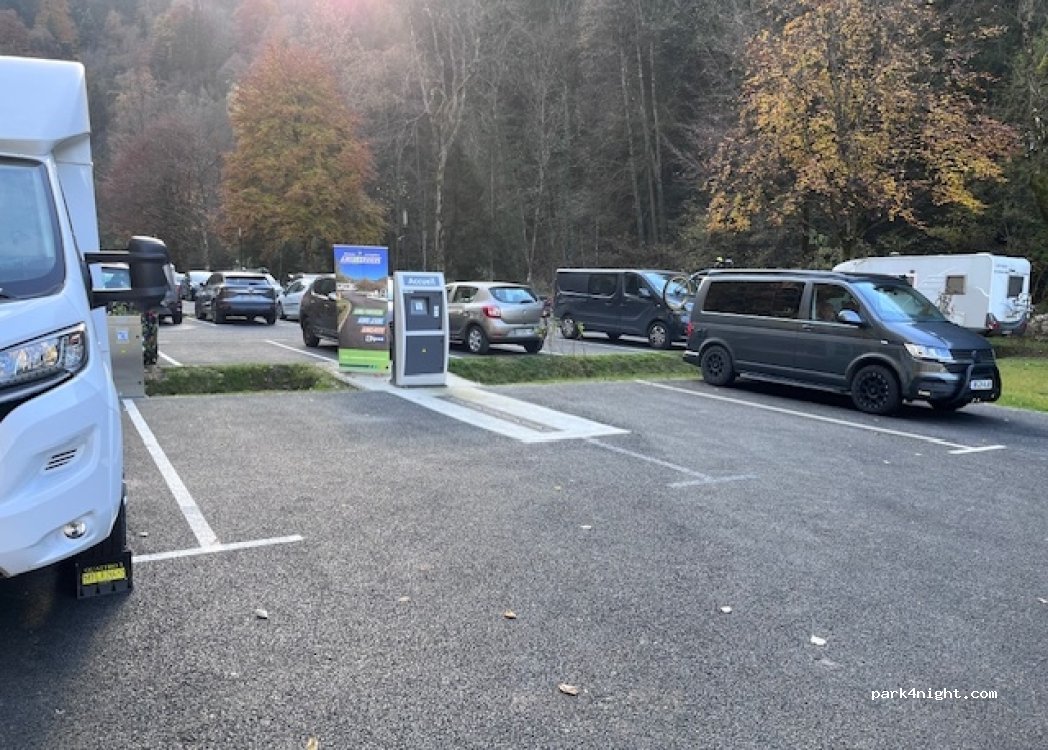 Nous avons passé la nuit, très calme sauf bruit de l'ascenseur des thermes, gratuit. Vidanges ok, besoin appli Qipeo pour eau et rinçage. Parc enfants avec WC public. Belles balades, parfait enfants/chien.