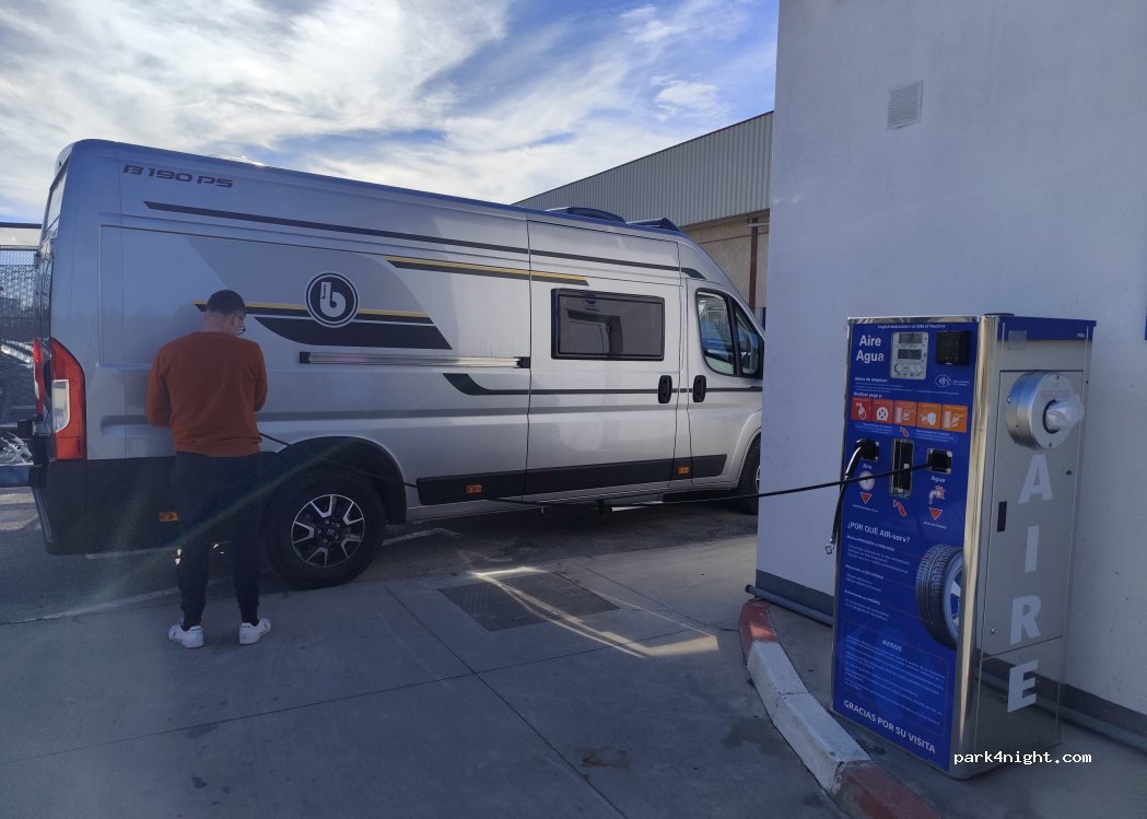 Water, we got full tank of water 90 liters. Behind that gas station. Only card payments. And with the same price we got air for our tires