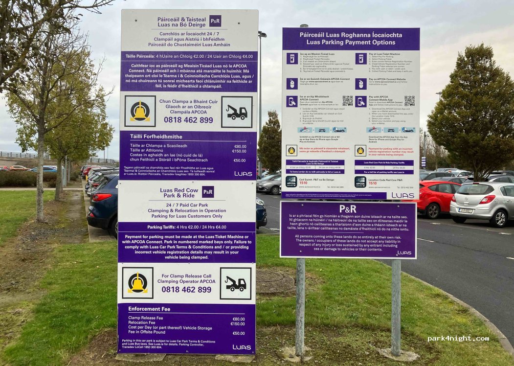 P&R gelegen op het tramstation Red Cow Park. Alleen bereikbaar via de autoweg. Neem afrit Clondalkin! Een beetje lawaaierig door verkeer en trams. Er is geen hoogtebarrière, het terrein is vrij vlak. Half uur met de tram naar Dublin. Elke 10 min. Neem de parkeer en kaartje-combinatie: Gereduceerd tarief.