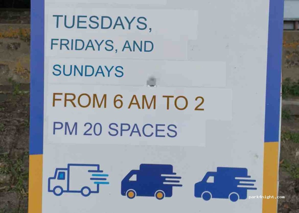 The signs are confusing. There appear to be 3 zones, one paying, one 4 hours outside 7pm to 7am and one restricted to market traders on Tuesday, Friday and Sundays (we arrived on Tuesday with no sign of a market so parked there). Lovely spot by the river and on the cycle path but spoilt by noisy kids and cars till 3am.