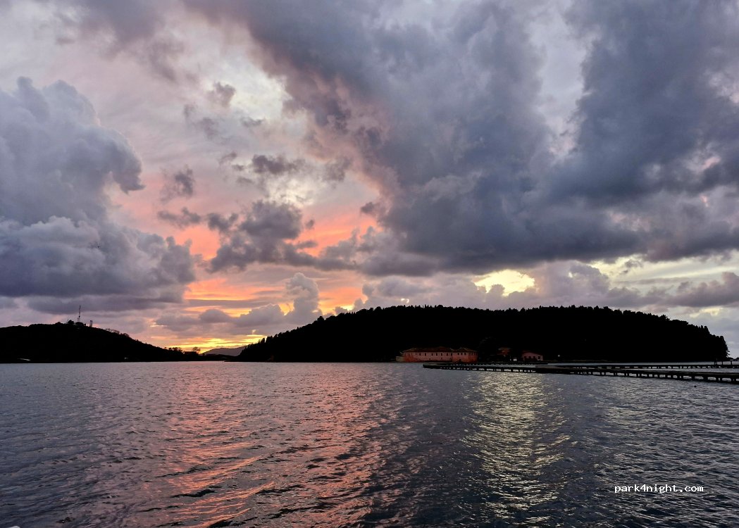 Magnifique coucher de soleil. Un sentier sur pilotis pour accéder à un ponton et au monastère. Vraiment un bel endroit mais totalement interdit d'y dormir. Nous étions 3 véhicules et avons tous été sommés de partir immédiatement par un gardien car zone protégée. Parking de jour uniquement