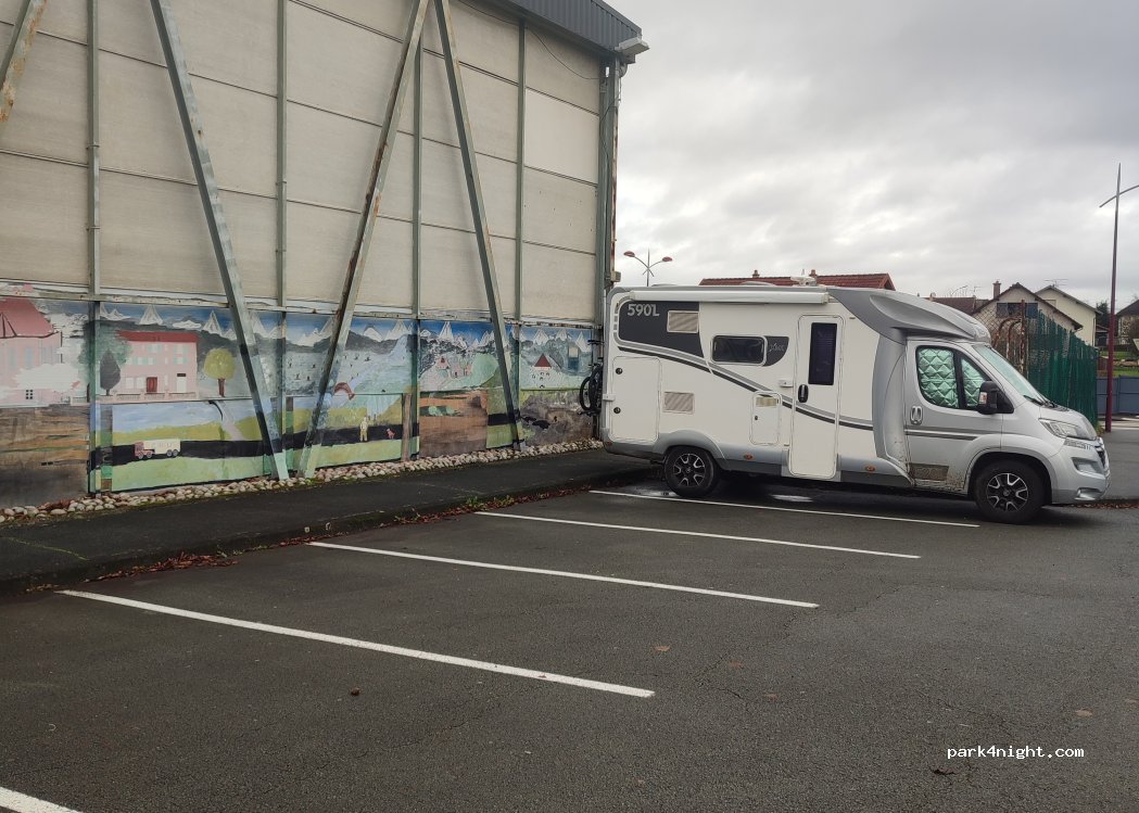 Bon endroit pour passer la nuit, places de parking gratuites sans restriction pour tout véhicule, nous avons passé la nuit avec notre camping-car de 6m et aucun problème. Endroit calme avec accès à une aire de jeux et très grande piste cyclable Pumptrack gratuite, idéale pour passer du temps avec les enfants. Le parking est derrière une école mais nous n'avons rien entendu, même si c'est un mardi normal en semaine.