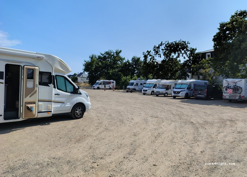 Grand parking sur gravier et boue Actuellement en travaux Pas de service, ni poubelle A 15 mn à pied du centre Calme la nuit Merci à la municipalité de nous accueillir