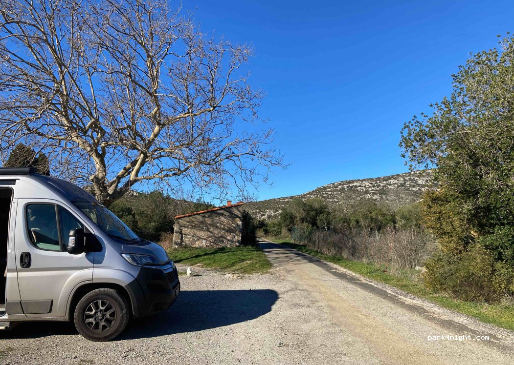 Parking to visit the cave of La Cauna and relax and spend the night in peace. The path there is paved, narrow but with many alternative bays. There are several places where you can park on the way. There is also a large parking lot about 3 km in front. There is a stone house on site with a barbecue area and old tables and chairs. The house can be private. The cave is 1 km from the site and is definitely worth a visit. Go back 50 m from the parking lot and simply follow the gravel path. There is no network on site. Enjoy nature.