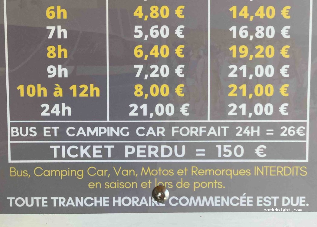 Parking payant, forfait camping-car de 26 euros pour 24h. Le seul parking de la zone où les camping-cars sont autorisés.
