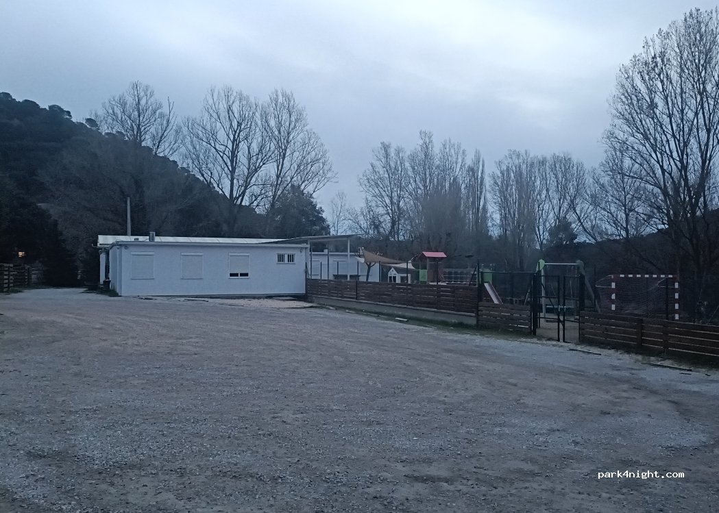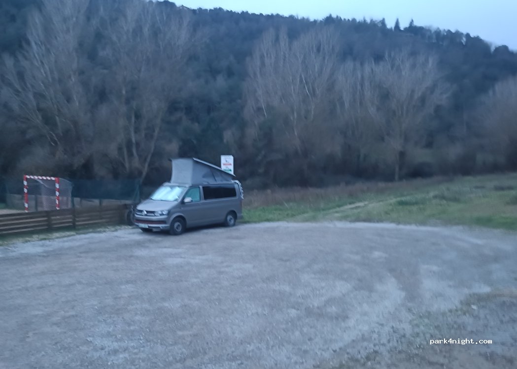 Pegado a la carretera. Sin sombra pero bastante bien nivelado